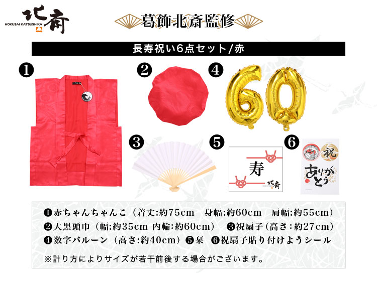 」感謝の気持ちを込めて、ちゃんちゃんこを送りませんか? 60歳の還暦、70歳の古希、77歳の喜寿、90歳の卒寿を迎える方へのお祝い品の定番、ちゃんちゃんこ(祝着)と頭巾、祝扇の3点に栞と化粧袋とバルーンを加えた6点セットになります。