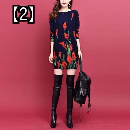 ワンピース レディース 秋冬 総柄 ニットミニ 丈 セーター 花